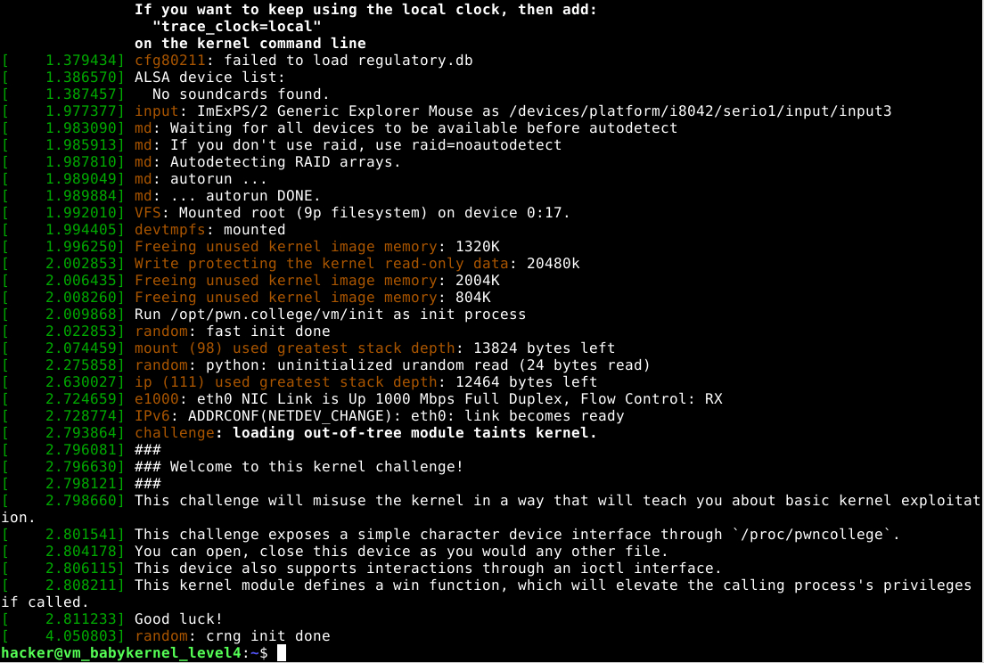 [ 2.798660] 이 챌린지는 기본 커널 악용에 대해 알려주는 방식으로 커널을 오용합니다.