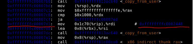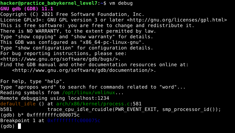 8. vm debug 명령어를 이용해서 디버깅을 할껀데, 위에서 찾은 0xffffffffc000075c 메모리 주소에 브레이킹을 걸어준다.