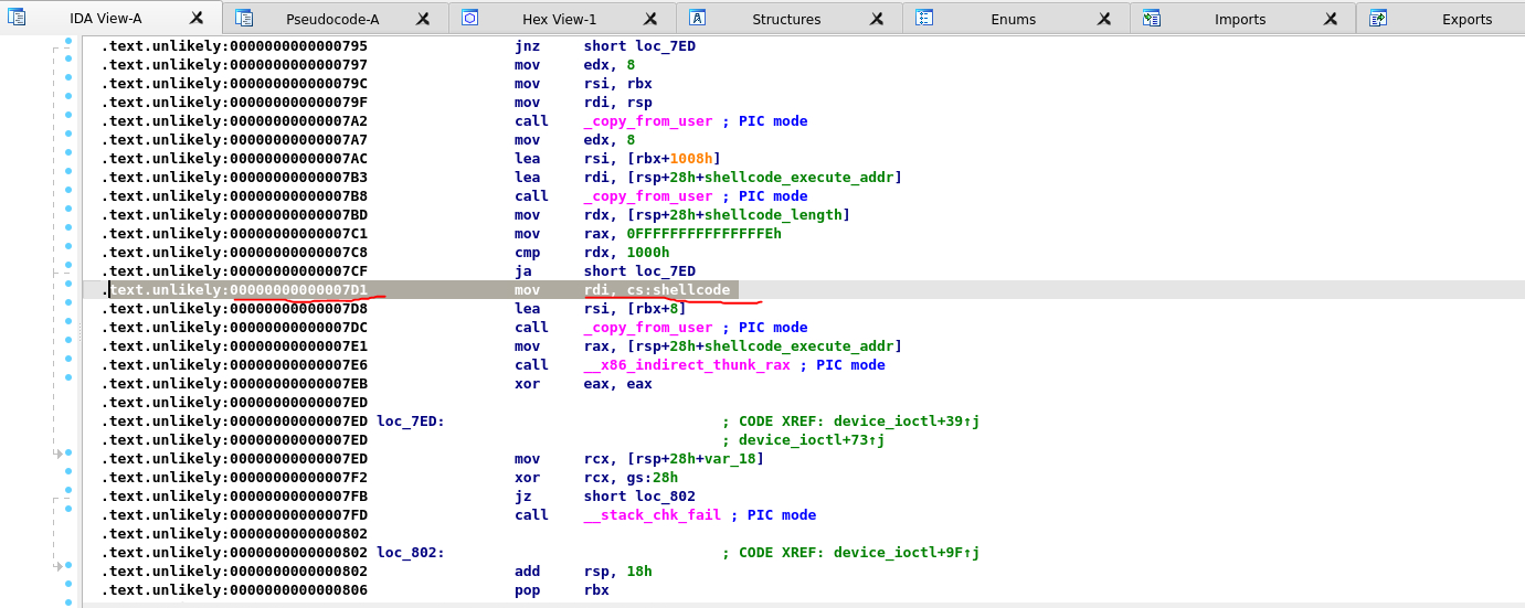 10. device_ioctl에서 IDA View-A를 살펴보면 shellcode쪽 메모리를 찾을 수 있다.