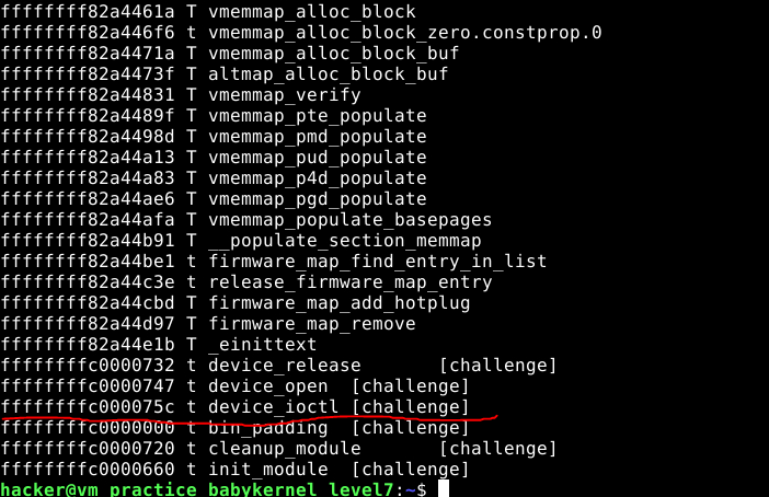 7. sudo cat /proc/kallsyms 명령어를 이용해서, ioctl 메모리 주소를 찾아준다.