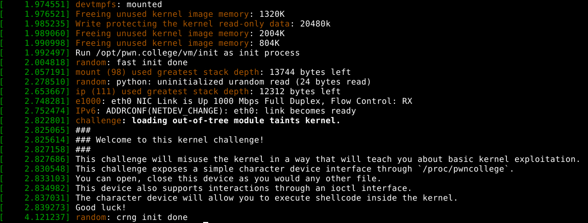 [ 2.827686] 이 챌린지는 기본적인 커널 악용에 대해 알려주는 방식으로 커널을 오용합니다.
