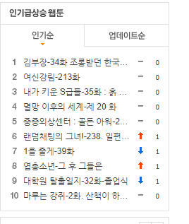 네이버 웹툰에 접속하여 인기급상승 웹툰의 인기순 목록을 불러오는 것이다.