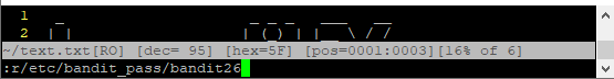 more명령어로 불러오기때문에, more명령어로 접속이 끊기기전에 /etc/bandit_pass/bandit26 에서 패스워드를 읽어야겠다.