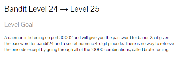 데몬은 포트 30002에서 수신 대기 중이며 bandit24에 대한 암호와 비밀 숫자 4자리 핀코드가 제공된 경우 bandit25에 대한 암호를 제공합니다.
